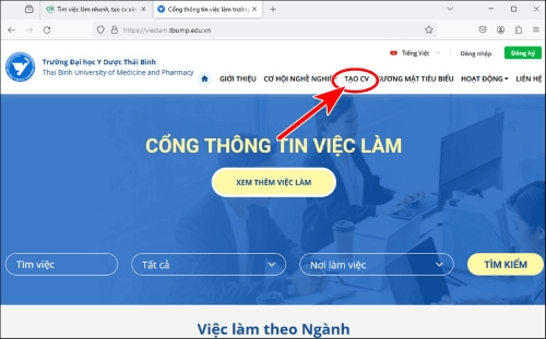 Bước 1: Đầu tiên bạn vào trang tạo CV xin việc tại cổng thông tin việc làm Trường Đại học Y Dược Thái Bình https://vieclam.tbump.edu.vn, chọn Tạo CV trên thanh công cụ.