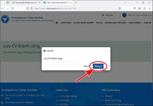 - Bảng thông báo Lưu CV thành công, chọn Đồng Ý và hệ thống sẽ tự động chuyển bạn đến cổng thông tin việc làm Trường Đại học Y Dược Thái Bình.