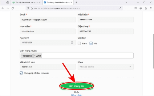 - Sau khi đã nhập đủ thông tin trên cổng thông tin việc làm trường Trường Đại học Y Dược Thái Bình, bạn chọn Gửi thông tin.