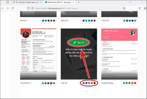 Bước 3: Lúc này hệ thống sẽ chuyển bạn đến trang tạo CV xin việc, tại đây bạn chọn Mẫu CV xin việc, Màu và nhấn nút Tạo CV ngay chính giữa như hình bên dưới.
