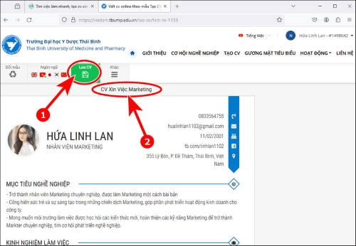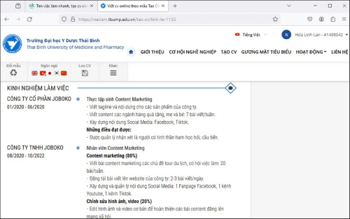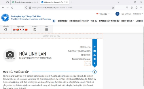 Cách tạo CV xin việc trên cổng Trường Đại học Y Dược Thái Bình